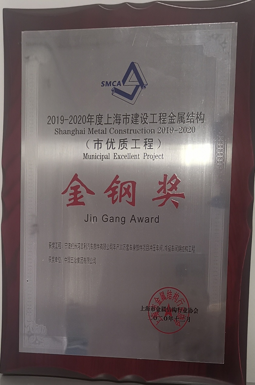 宁波杭州湾吉利汽车部件有限公司年产30万套车身部件项目标准车间钢结构工程获2019-2020年度第二批上海市建设工程金属结构“金钢奖”(市优质工程)