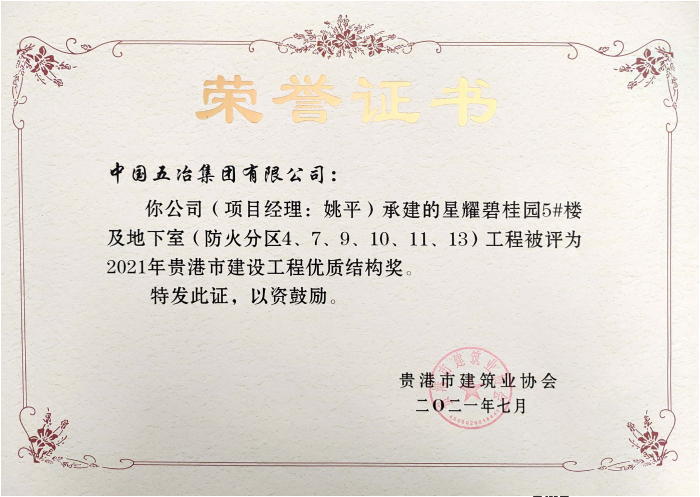 星耀碧桂园5#及地下室工程—2021年贵港市建设工程优质结构奖