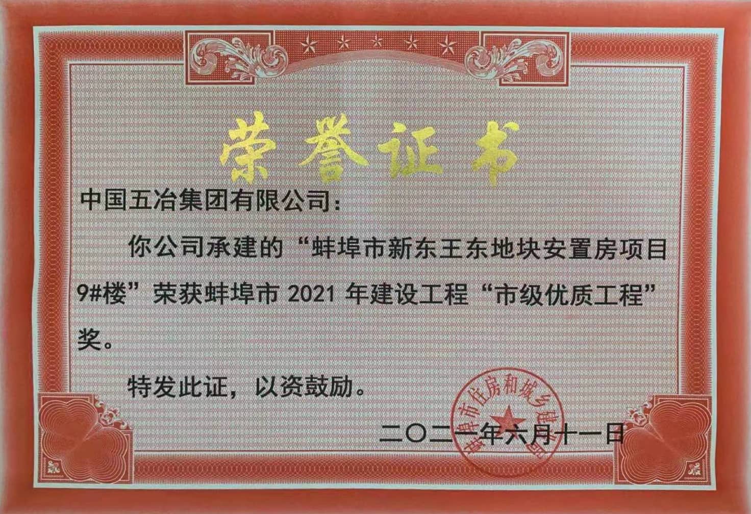 蚌埠市新东王东地块安置房项目9#楼荣获蚌埠市2021年建设工程“市级优质工程”奖