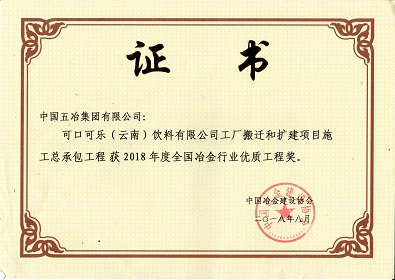 可口可乐(云南)饮料有限公司工厂搬迁和扩建项目施工总承包安装工程-2018年度全国冶金行业优质工程奖